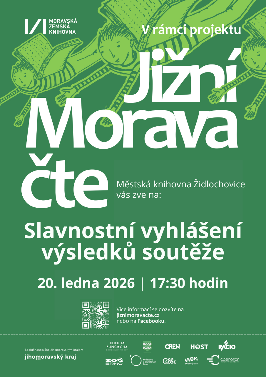 Slavnostní vyhlášení výsledků projektů Jižní Morava čte a Lovci perel proběhne v úterý 20. ledna v 17:30 hodin v Městské knihovně v Židlochovicích. V případě, kdy se nebudete moci této akce zúčastnit, lze si odměnu vyzvednout kdykoliv od 21. ledna v půjčovní době knihovny.