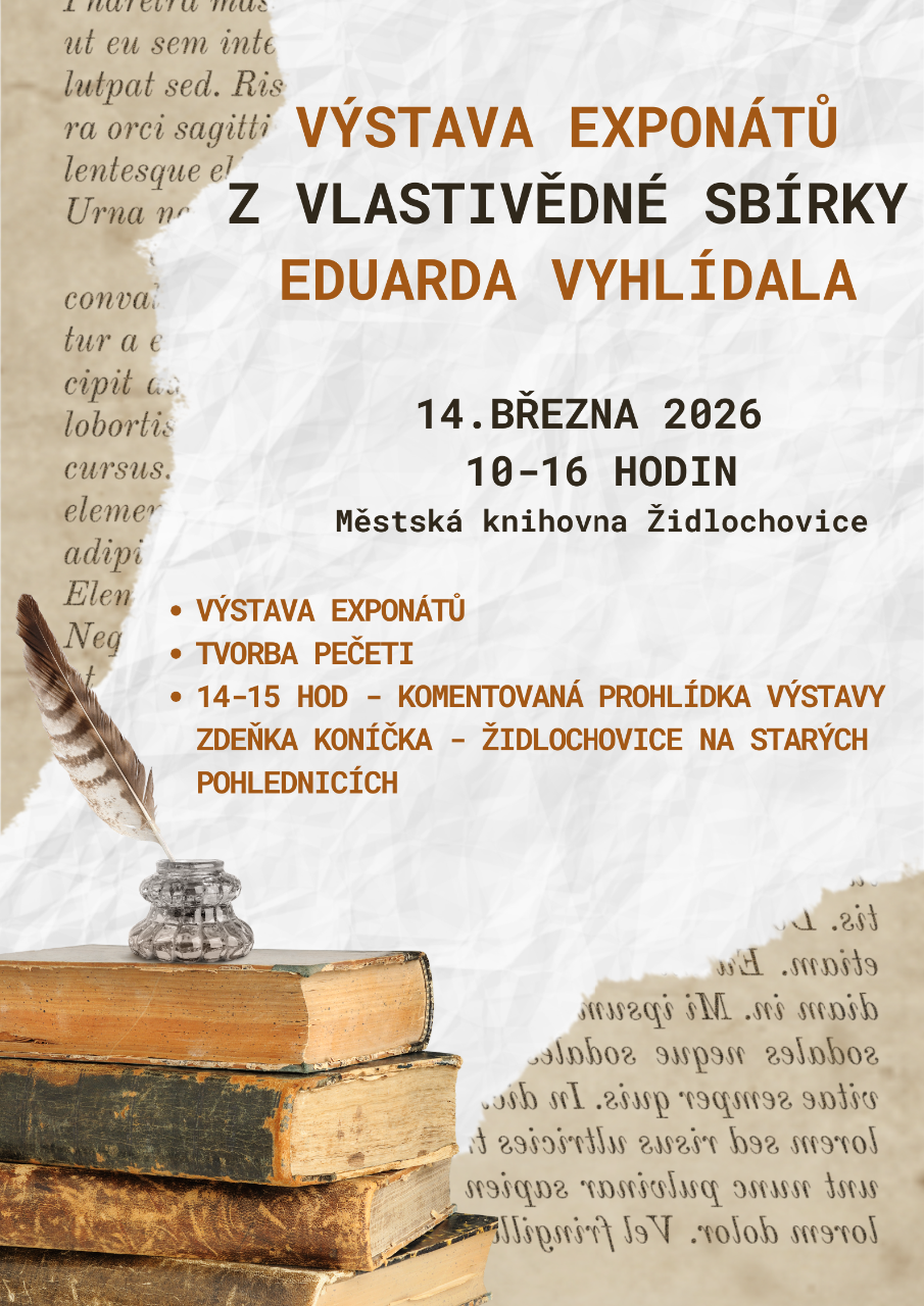 V sobotu 14. března od 10-16 hodin máte jedinečnou možnost si v knihovně prohlédnou výstavu exponátů z Vlastivědné sbírky Eduarda Vyhlídala. Jako doprovodný program je připravena od 14-15 hodin komentovaná prohlídka Výstavy Zdeňka Koníčka - Židlochovice na starých pohlednicích.